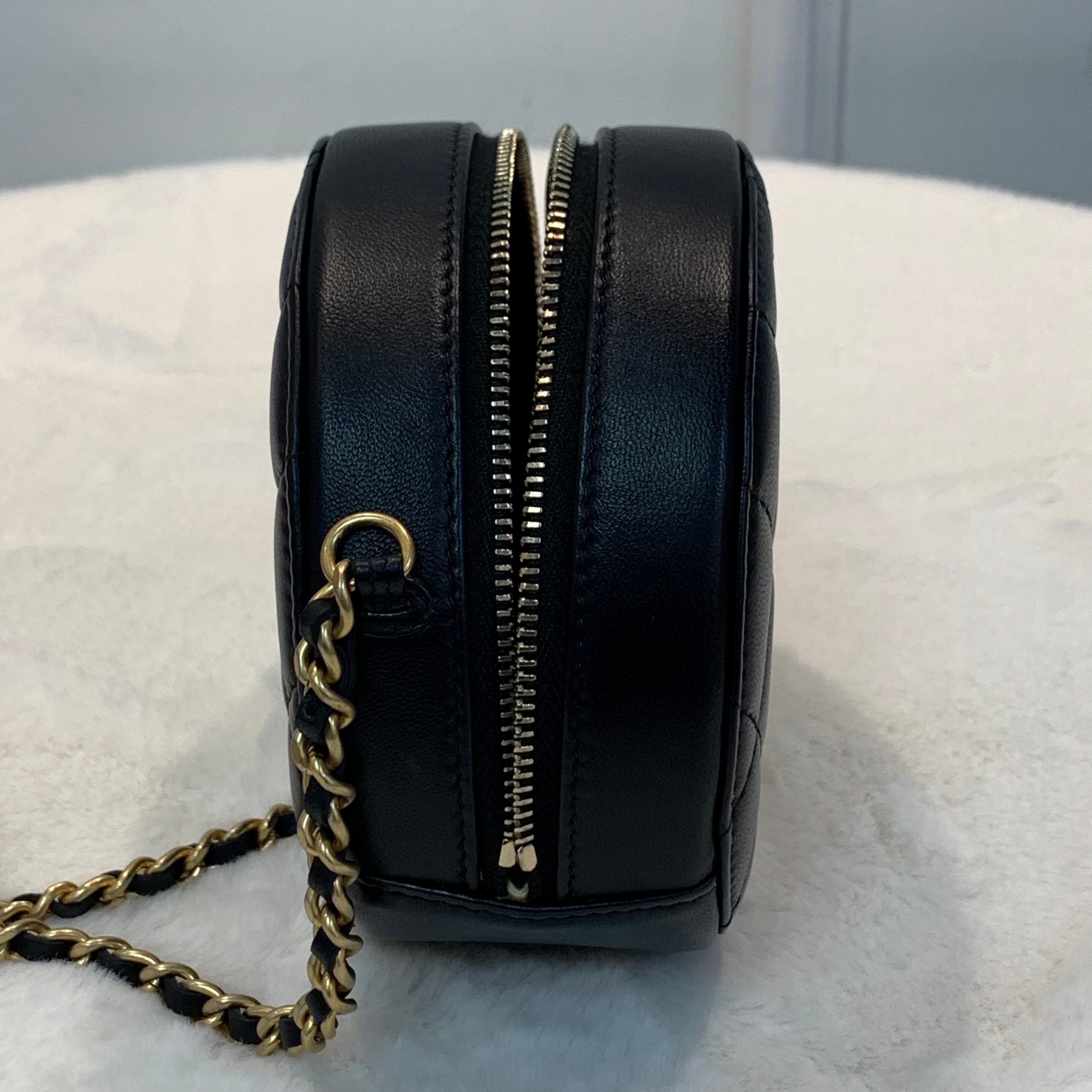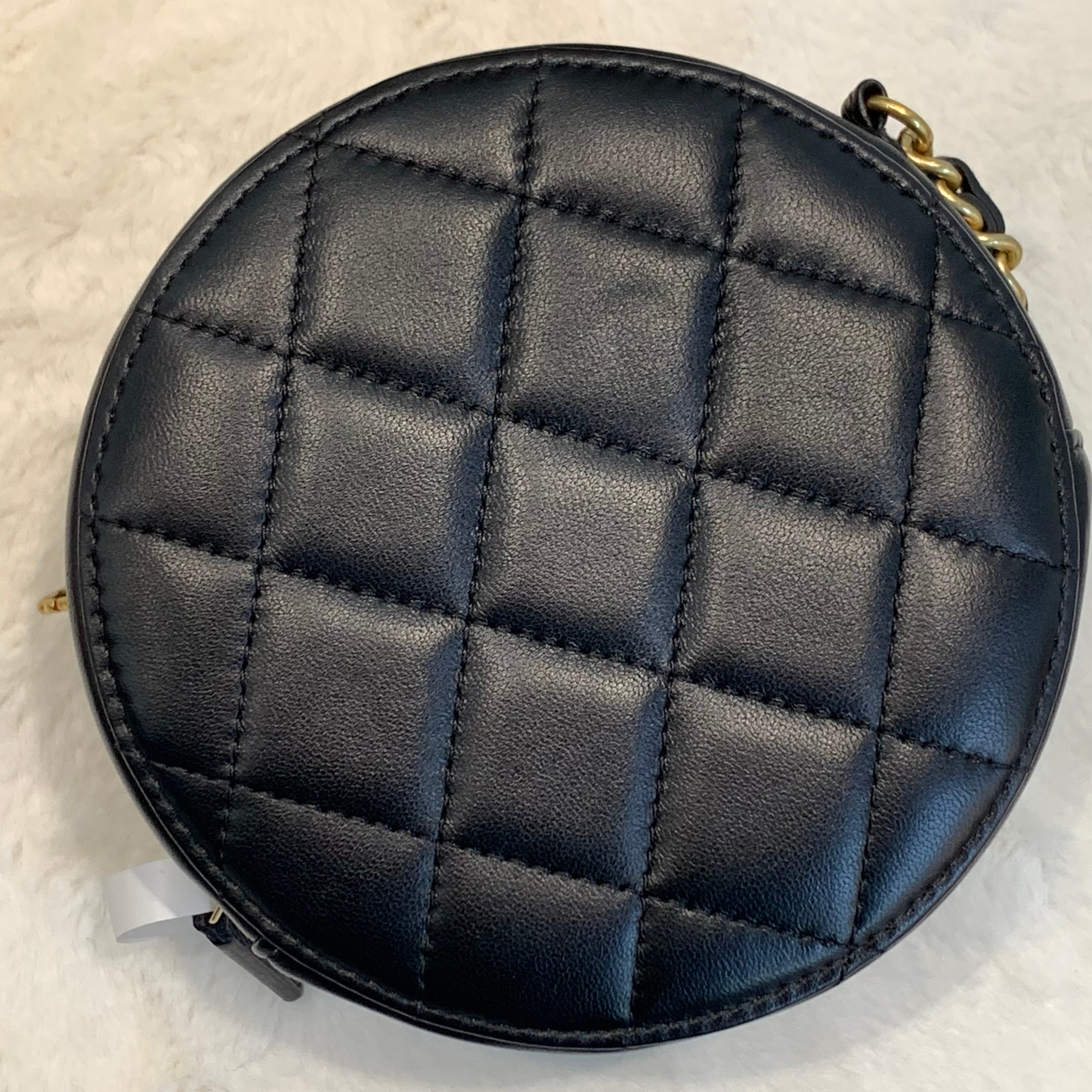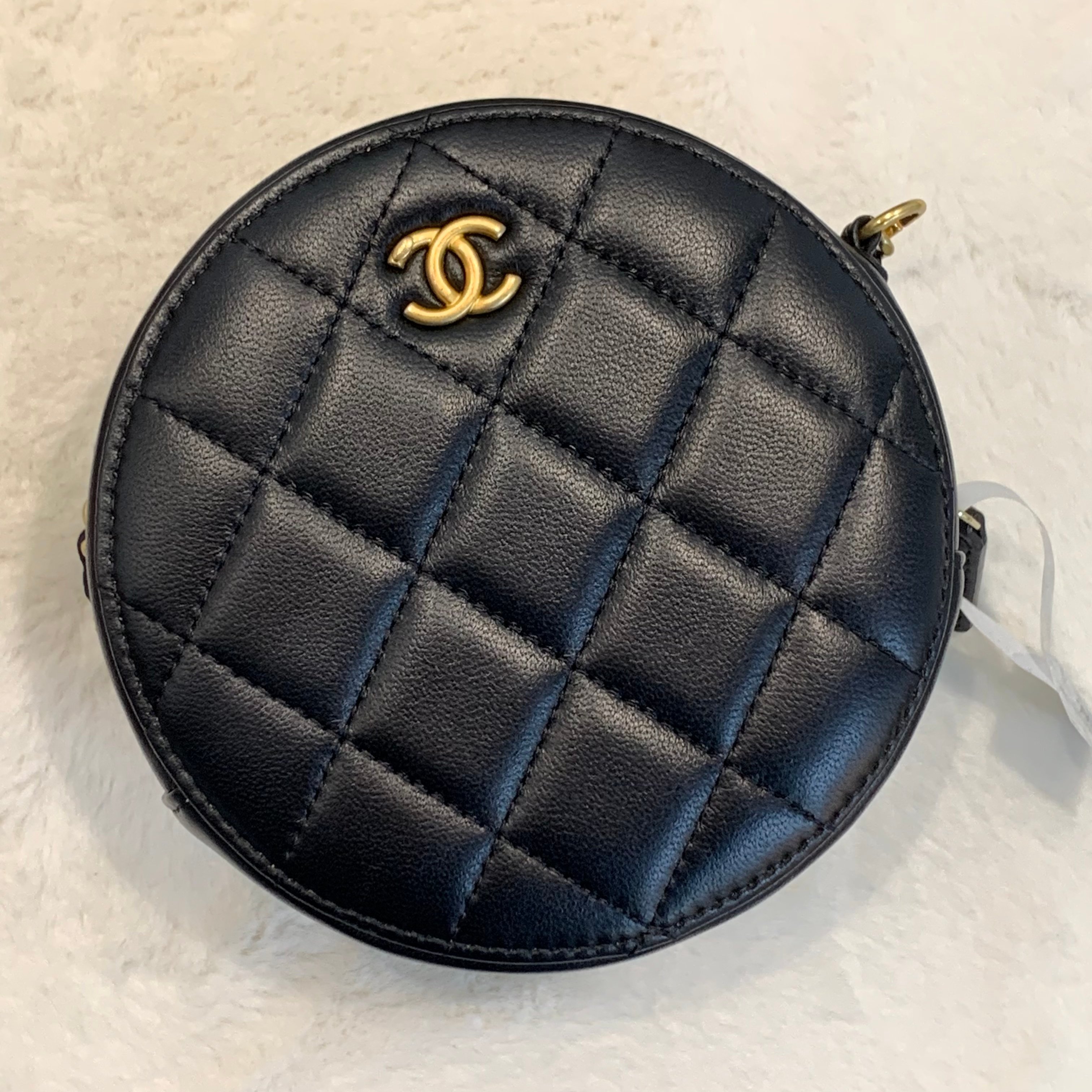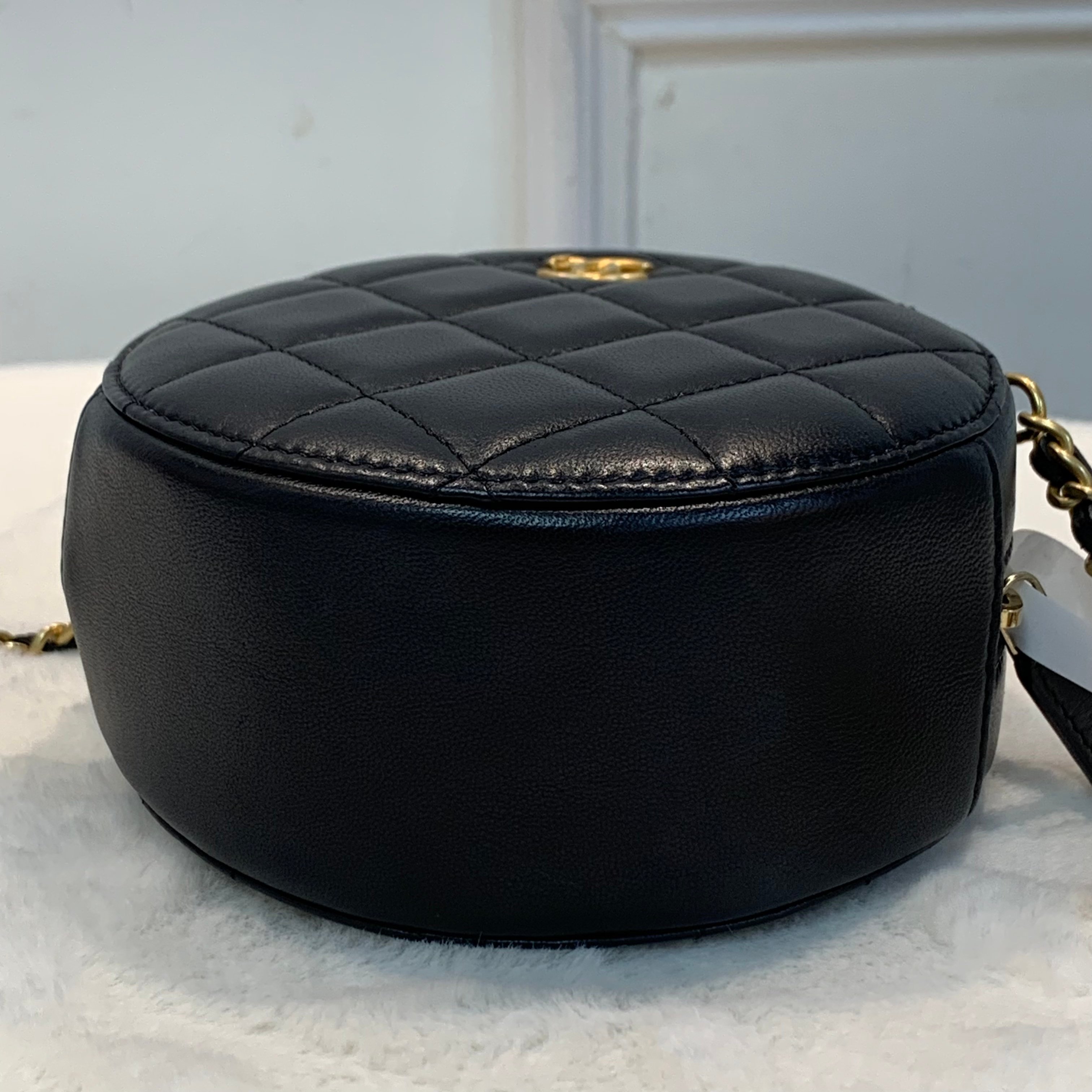 高級感Chanel 金球圓餅Rould clutch小包斜孭袋 顏色:黑色金扣 尺寸12x12cm 年份:31xxxxxx 材質:羊皮 配件:盒 塵袋 黑卡 成色:輕微使用痕跡