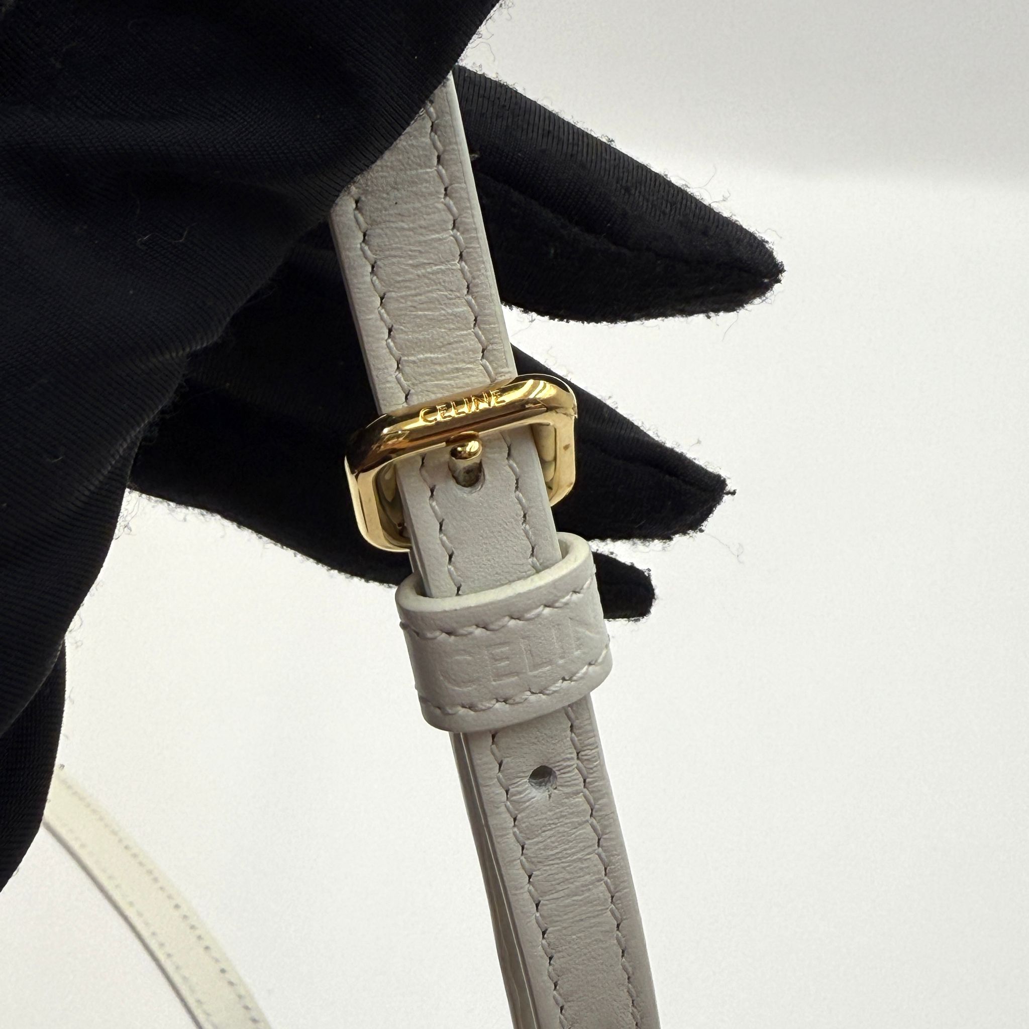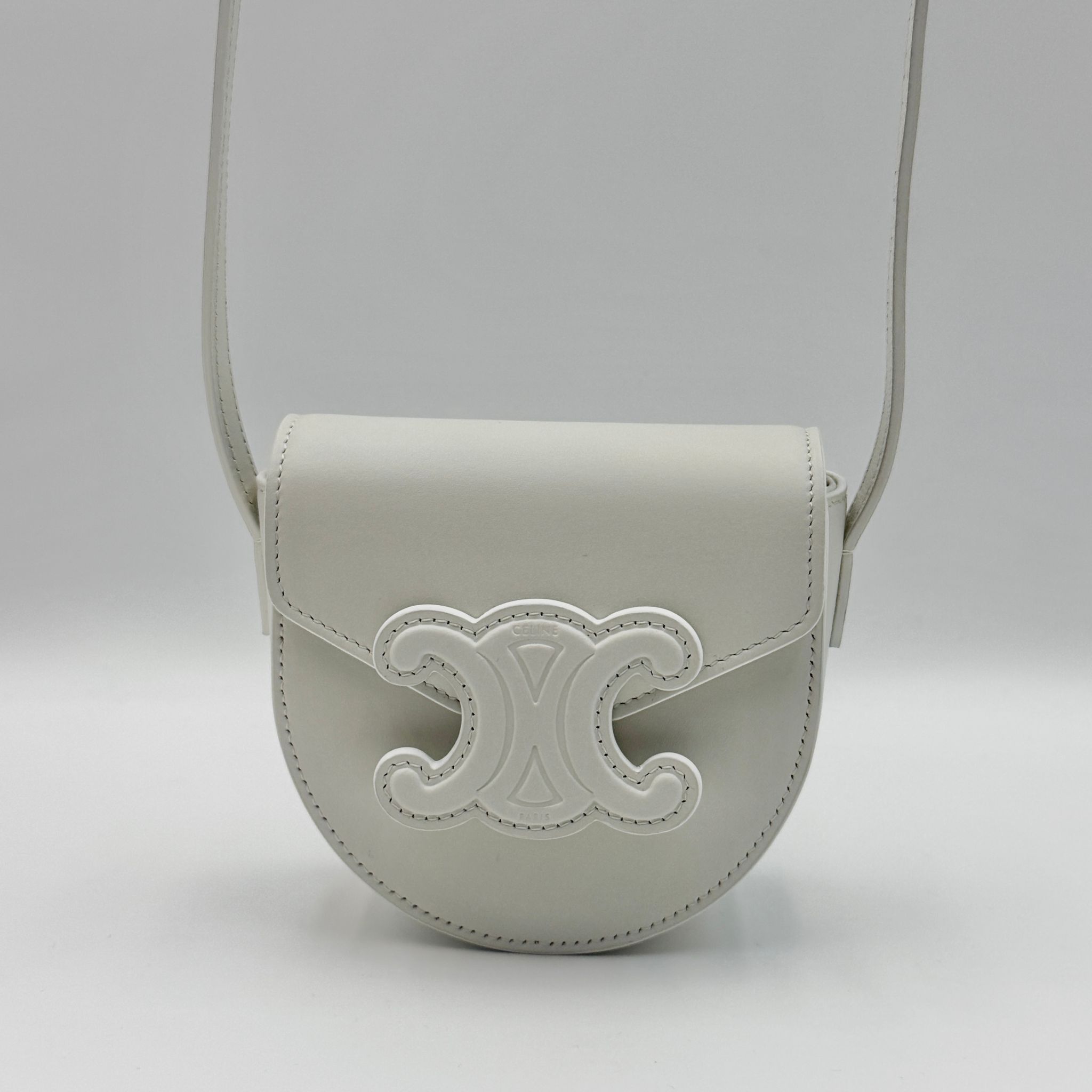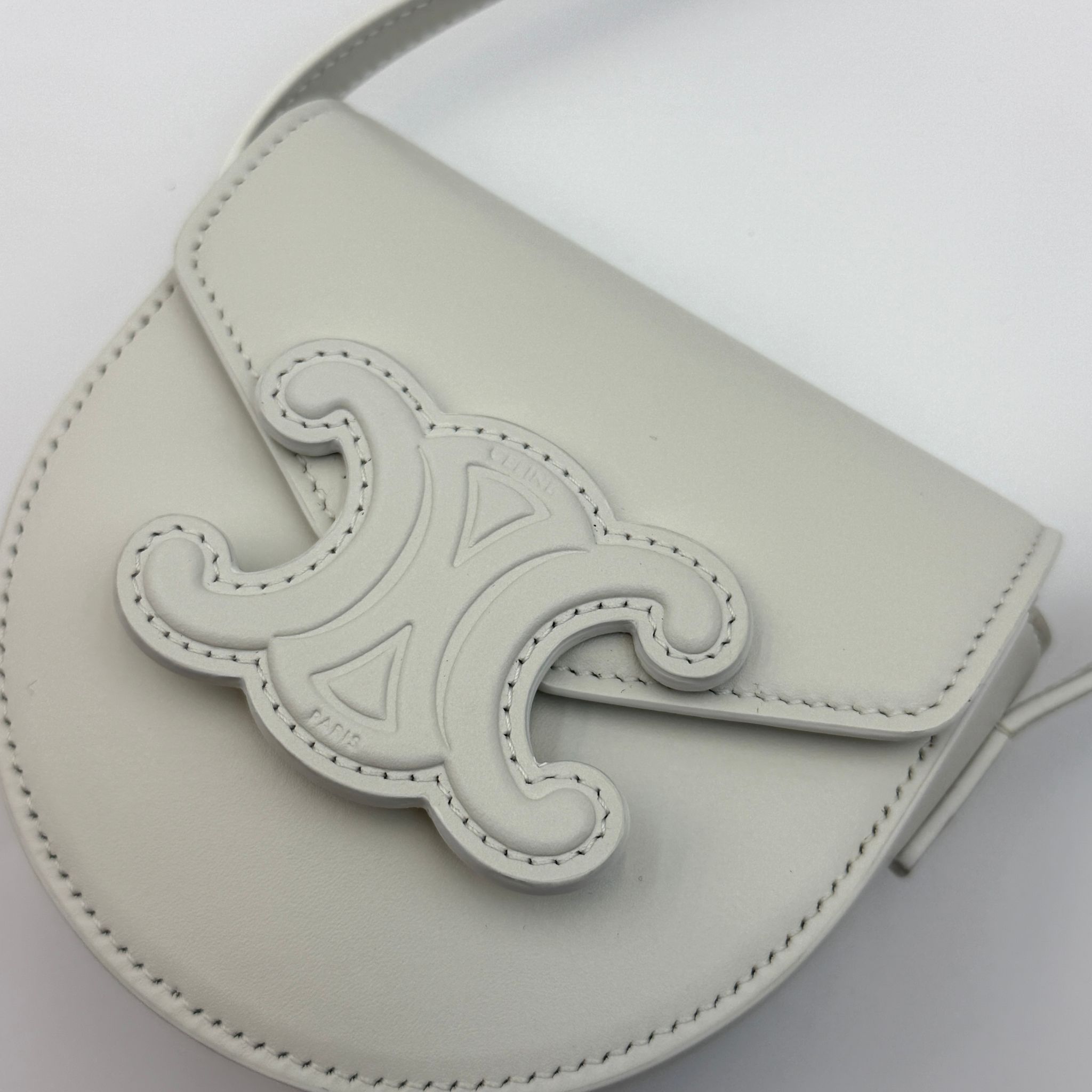 CELINE BesaceCuir Triomphe 凱旋門系列馬鞍包Mini版 22年新款 光面牛皮革 肩帶款 材質:牛皮 顏色:白色 年份:2022年 尺寸約:11*10cm 附件:防塵袋 原價:7900