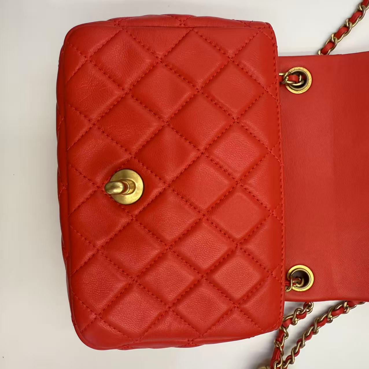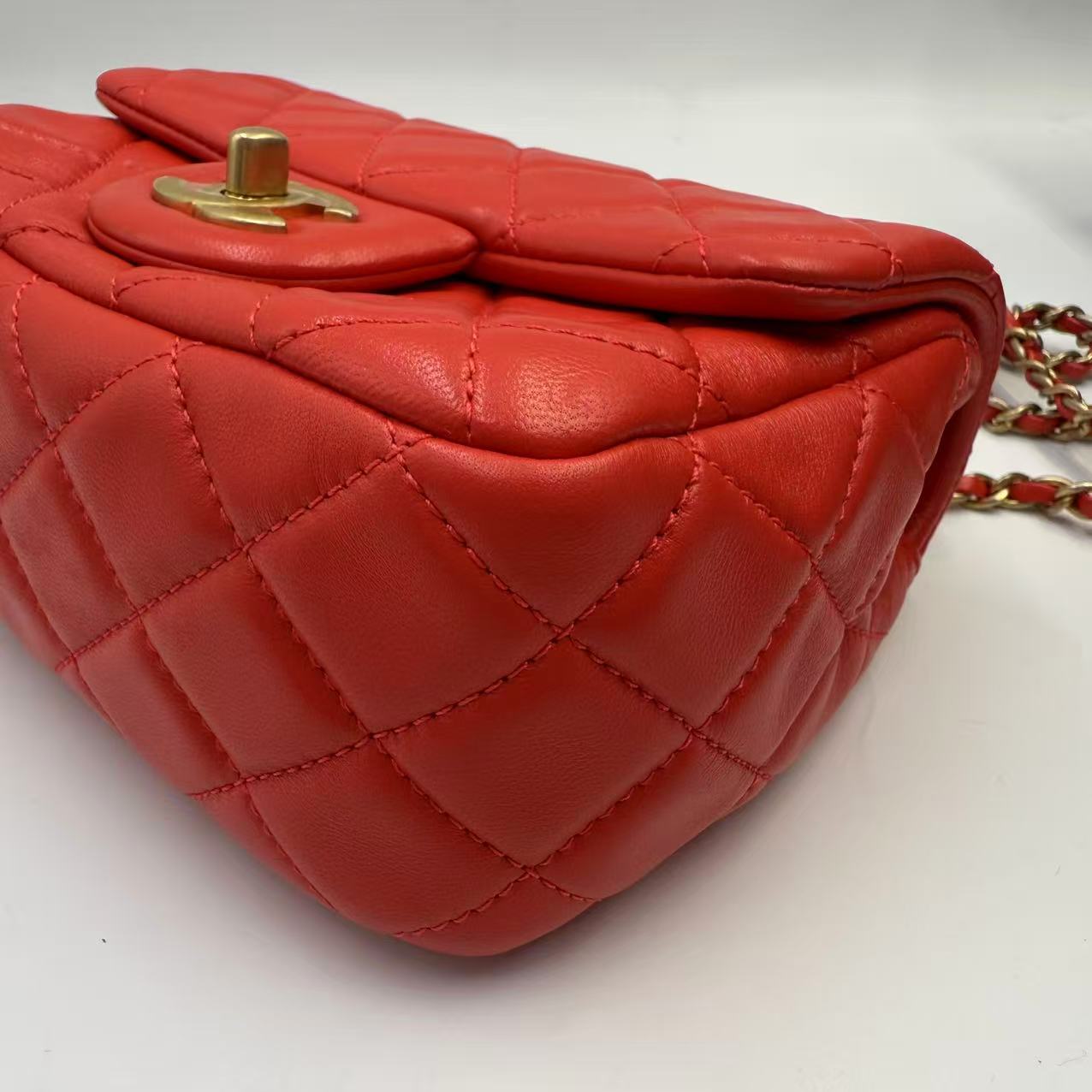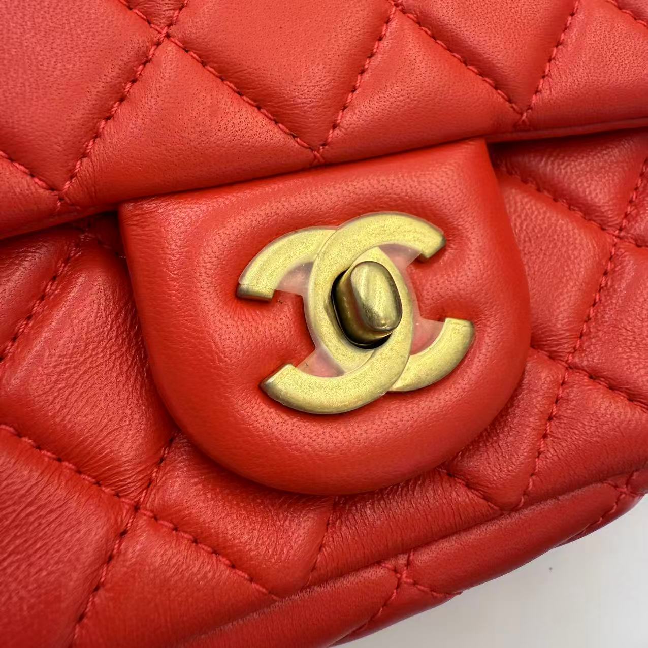 CHANEL Mini Flap Bag 珊瑚紅羊皮金球方胖子 尺寸: 13 x 18 x 7cm 皮質: 羊皮 顏色: 珊瑚紅 配件: 塵袋 成色: 輕微使用痕跡 年份: 29xxxxxx 原價 46000 UP