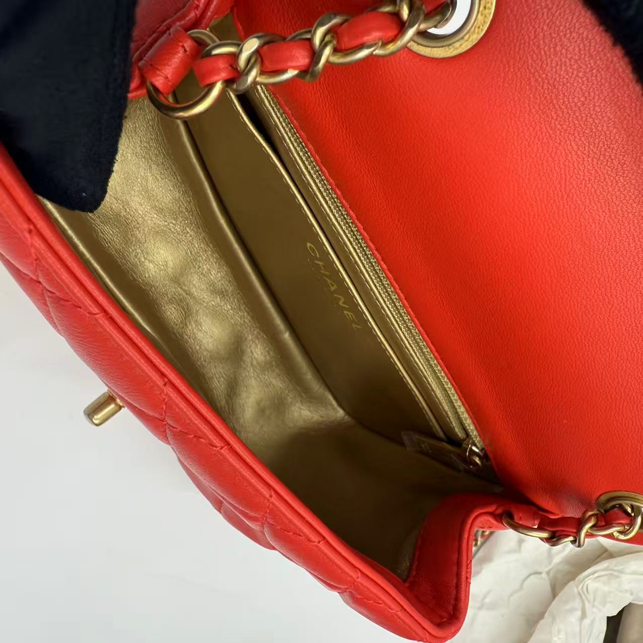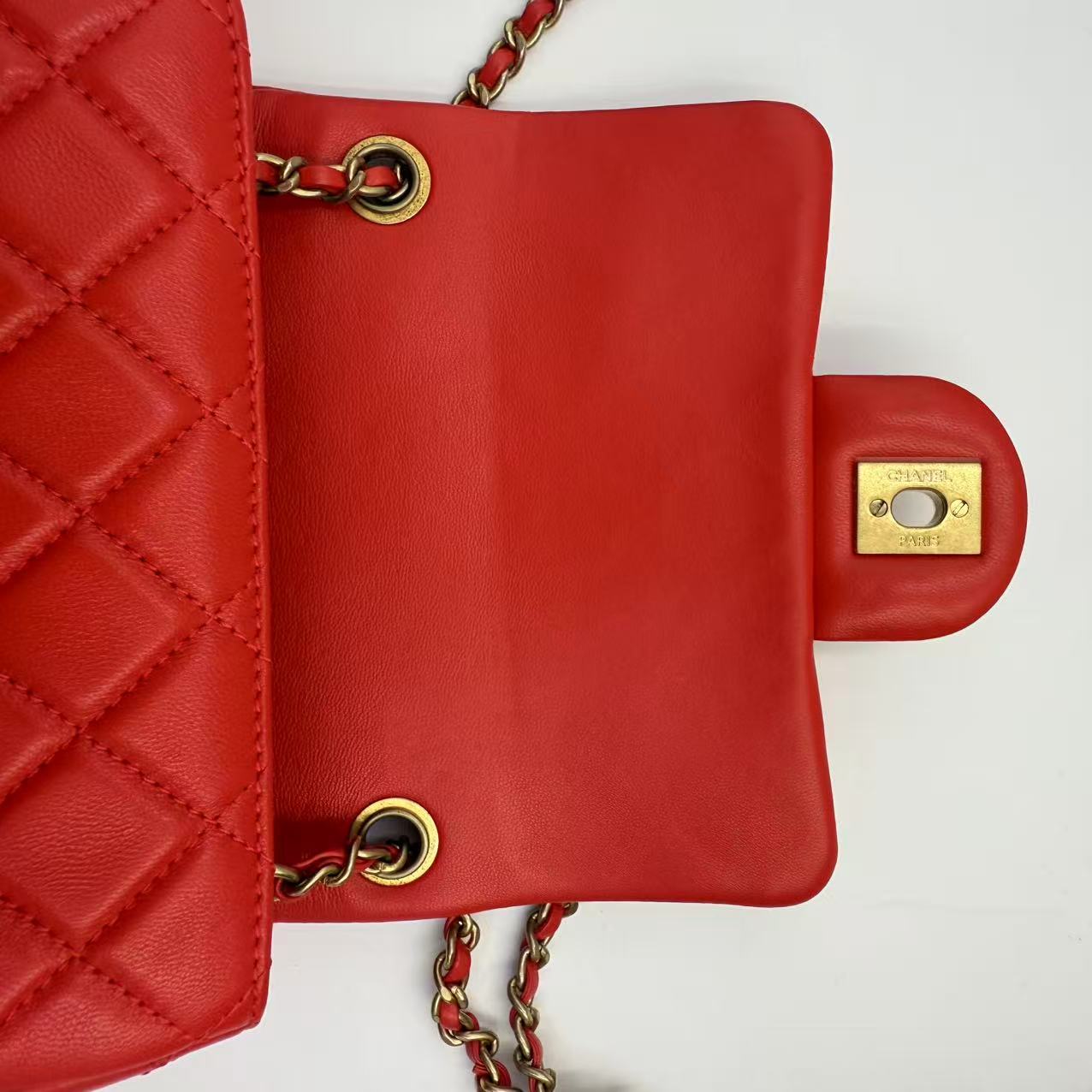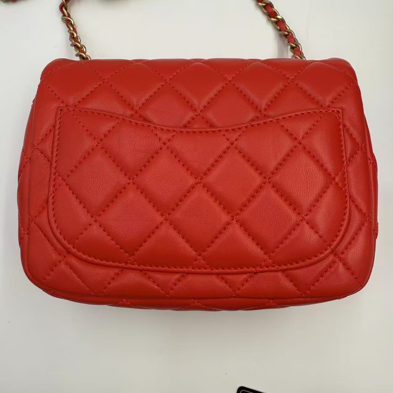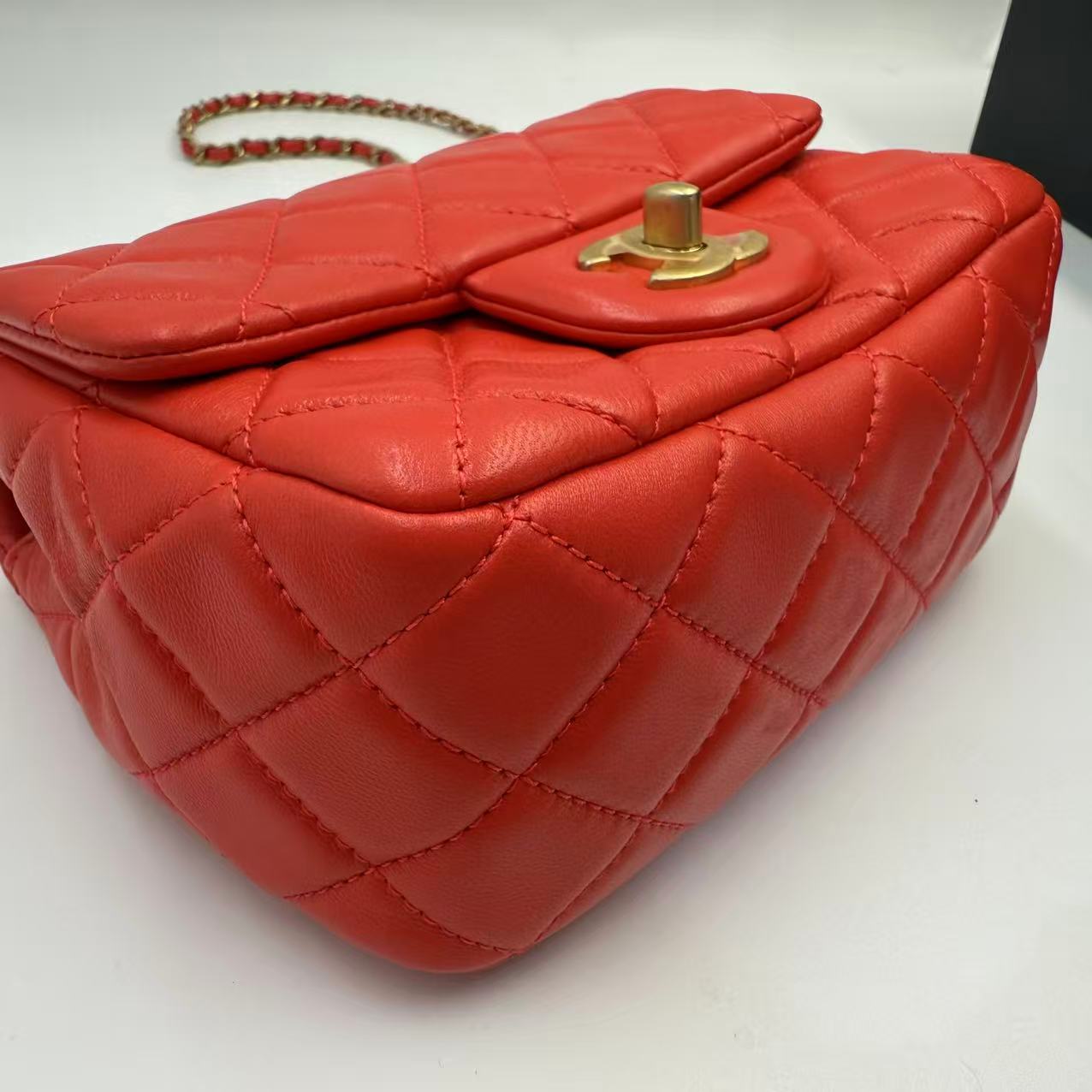 CHANEL Mini Flap Bag 珊瑚紅羊皮金球方胖子 尺寸: 13 x 18 x 7cm 皮質: 羊皮 顏色: 珊瑚紅 配件: 塵袋 成色: 輕微使用痕跡 年份: 29xxxxxx 原價 46000 UP
