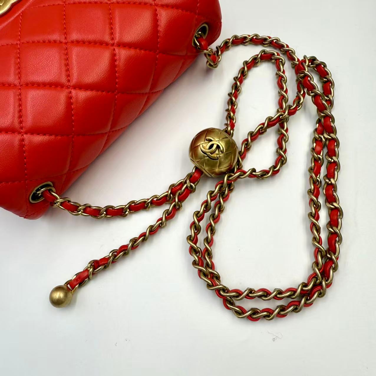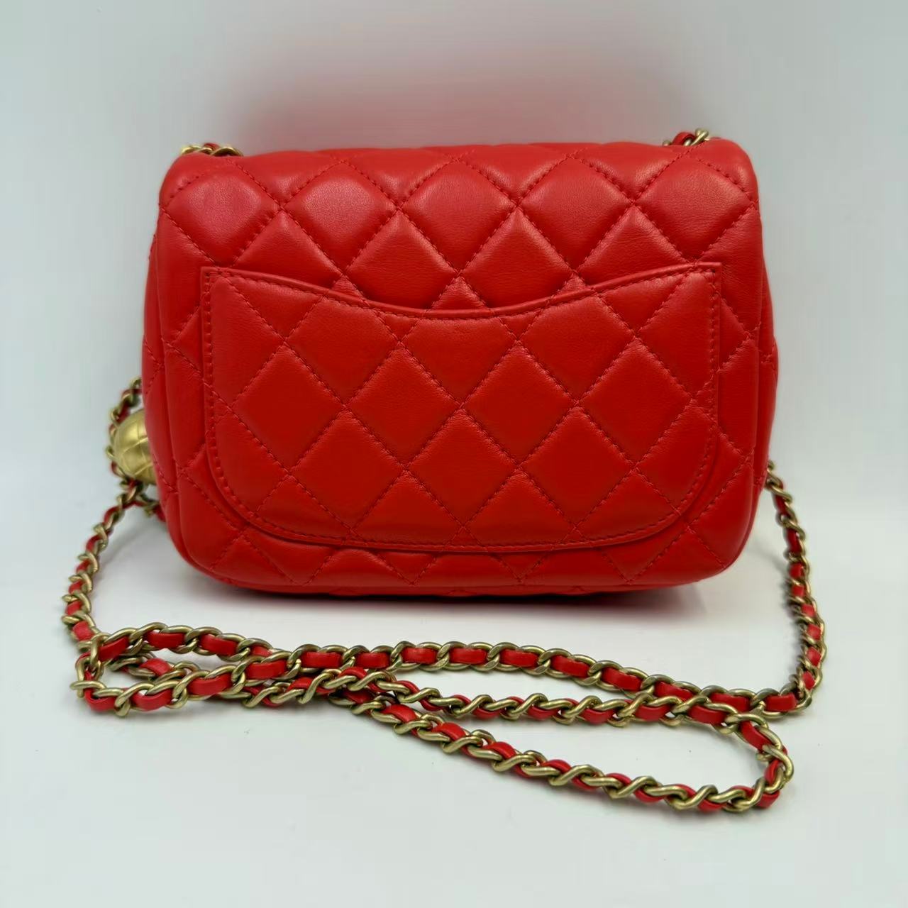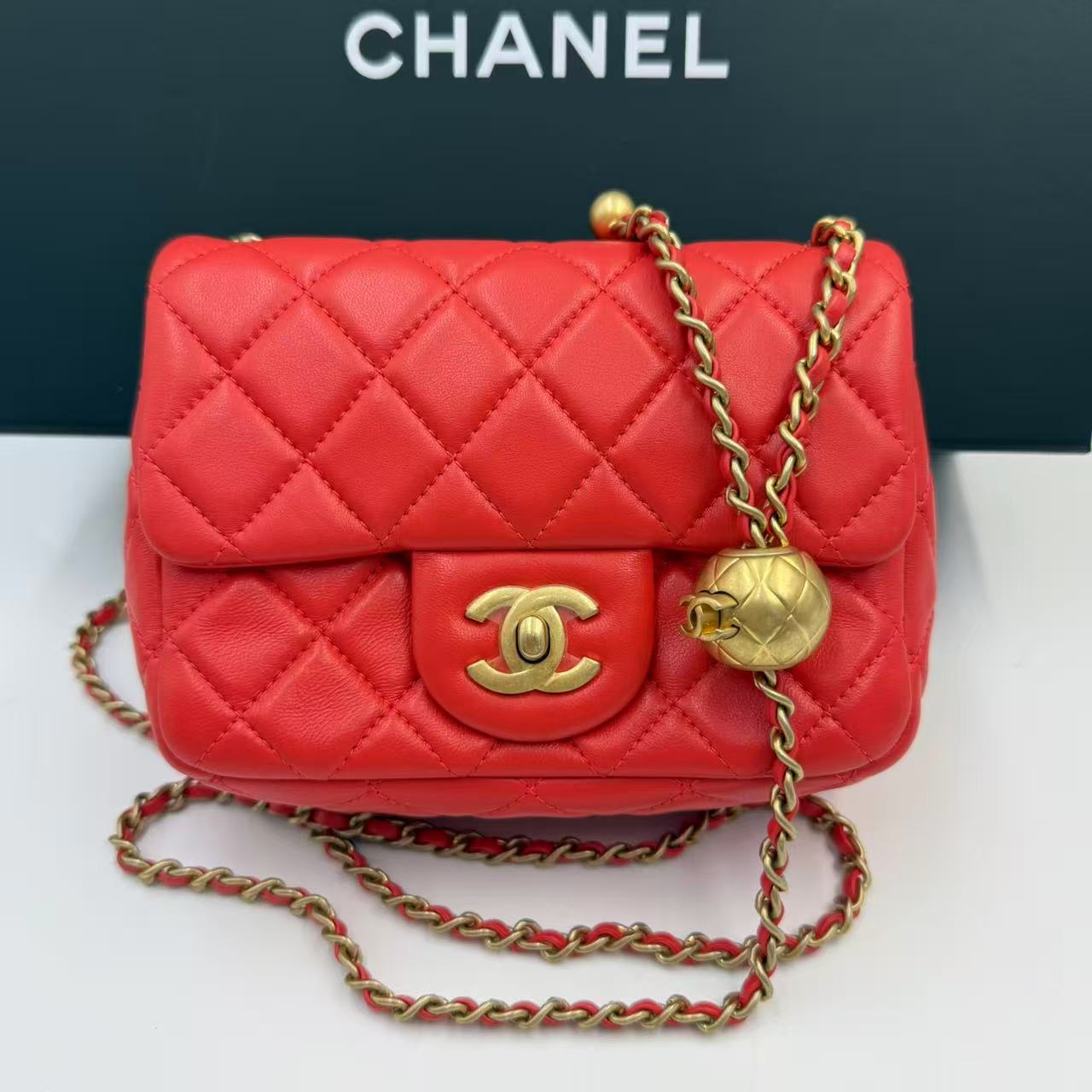 CHANEL Mini Flap Bag 珊瑚紅羊皮金球方胖子