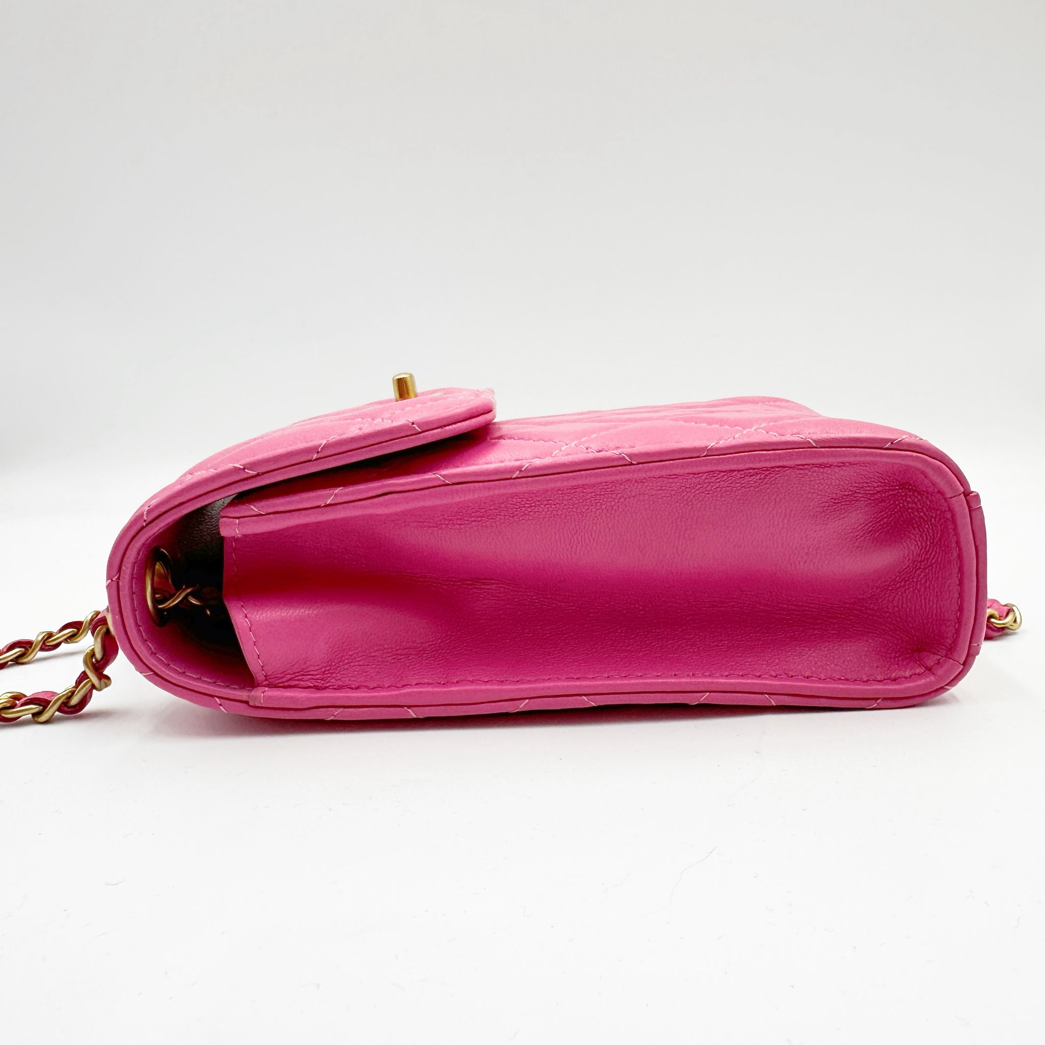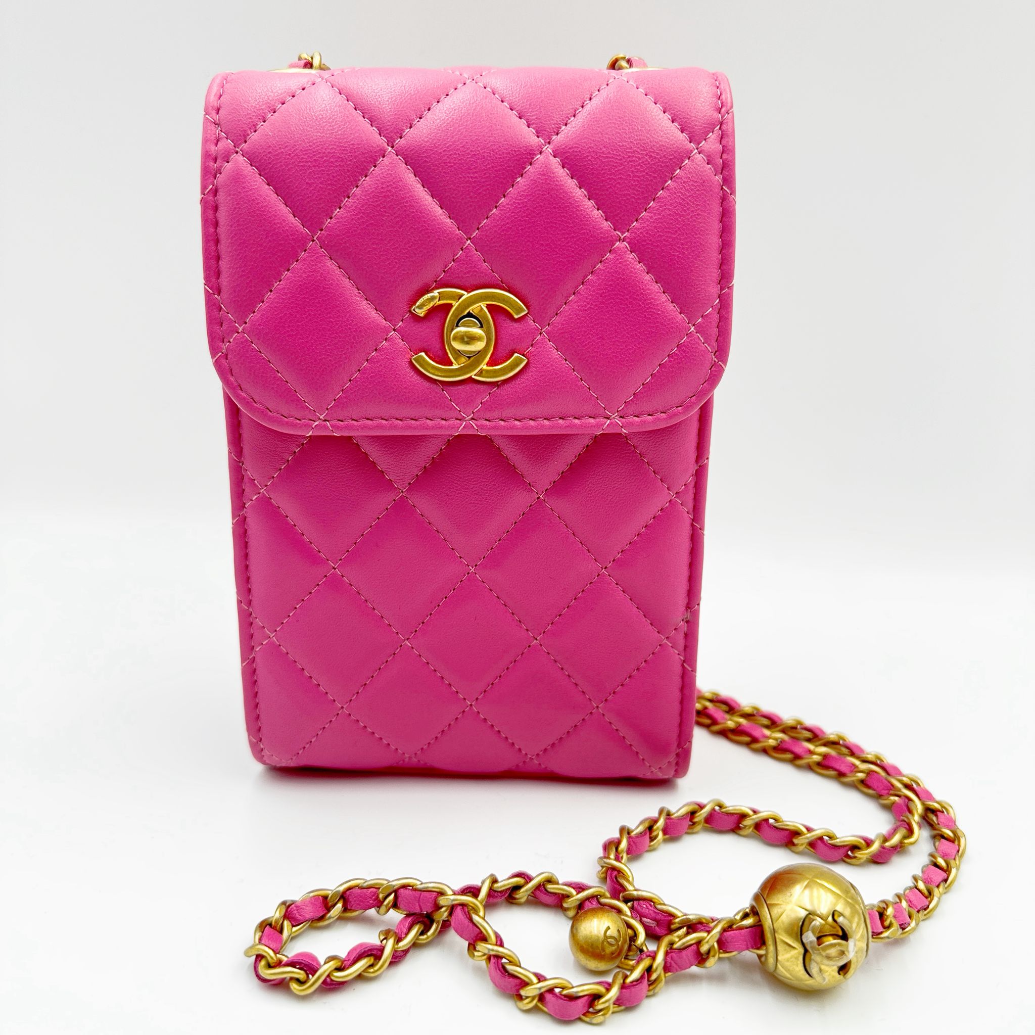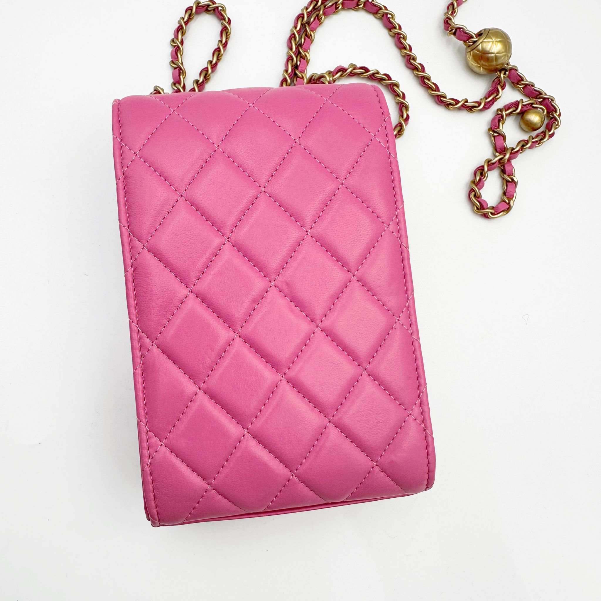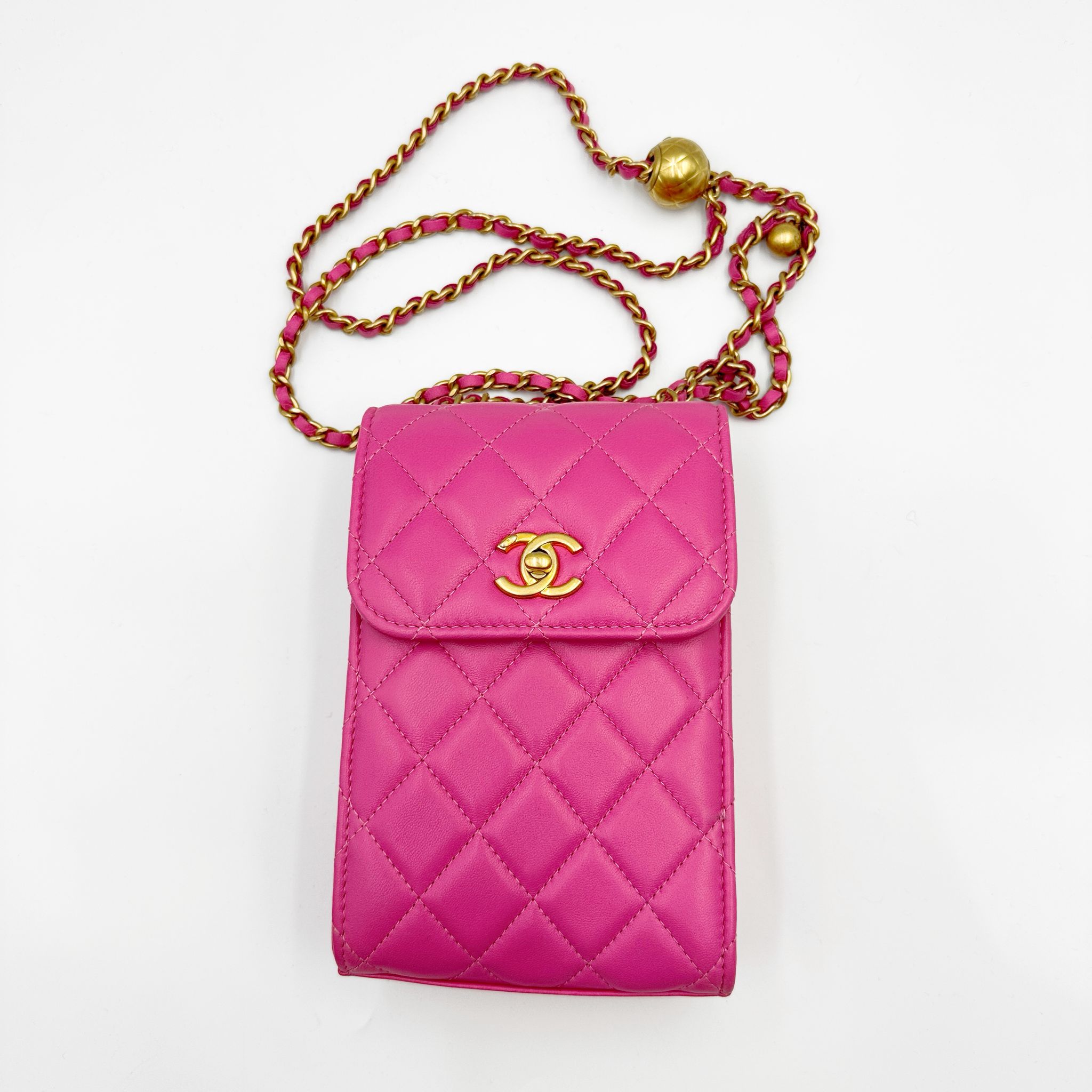 CHANEL Pearl Crush Phone Holder小金球菱格紋珍珠口蓋手機袋 尺寸: 11.5 x 6.5 x 18 皮質: 羊皮 顏色: 粉紅色 配件: 盒子,塵袋,黑卡 成色: 輕微使用痕跡 年份: 29xxxxxx 原價 20000 UP