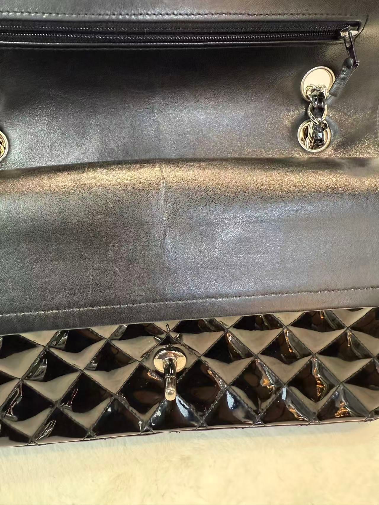 Chanel CF中號 黑銀漆皮 經典斜孭袋包 稀少收藏款 鐳射清晰 好價帶走~ 材質:漆皮 顏色:黑銀 年份 : 13xxxxxx 成色:正常使用痕跡 尺寸:15.5×25.5×6.5cm 公價:37000