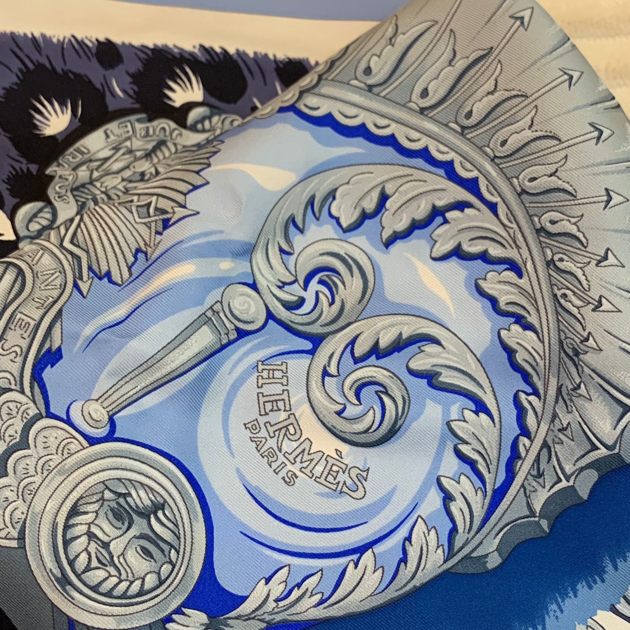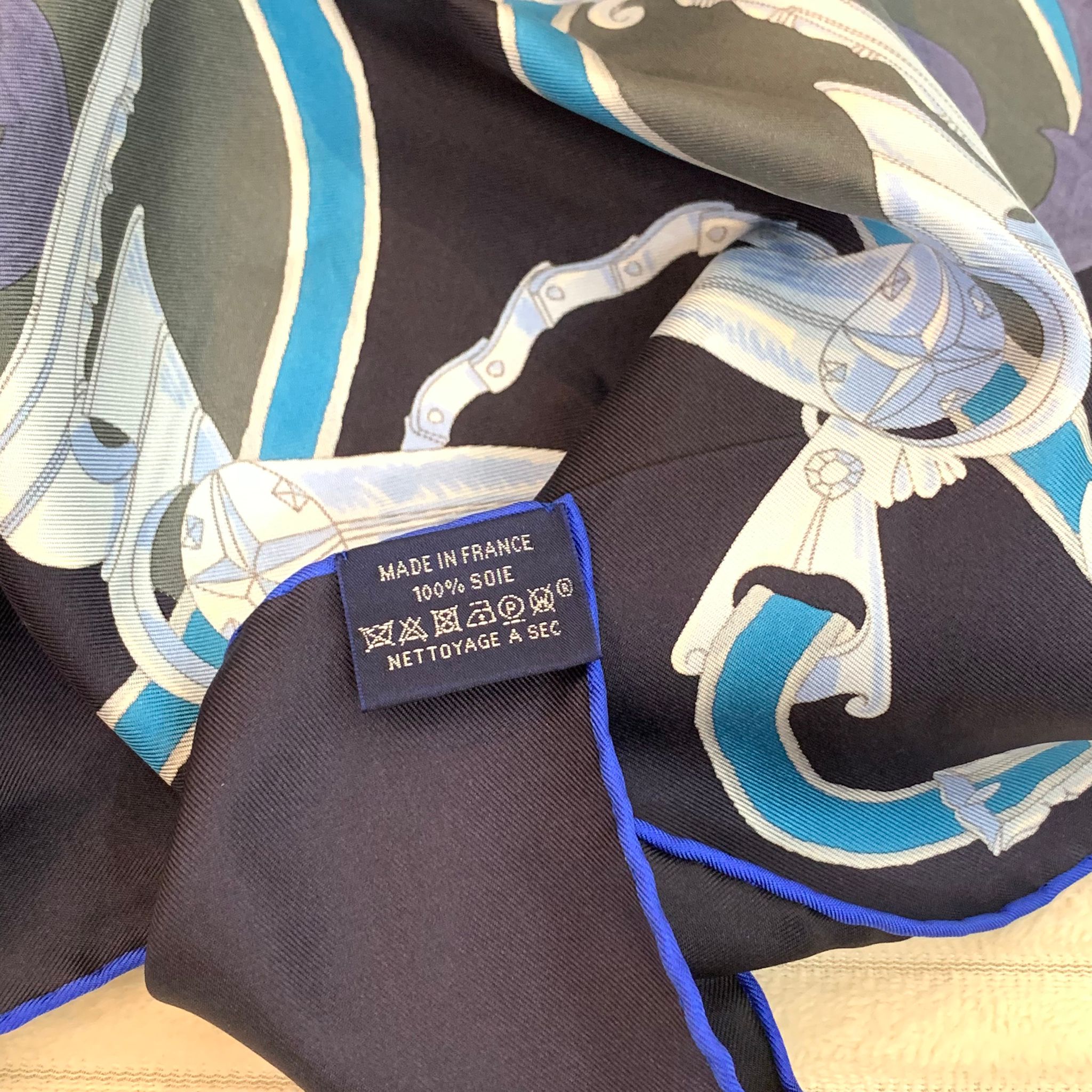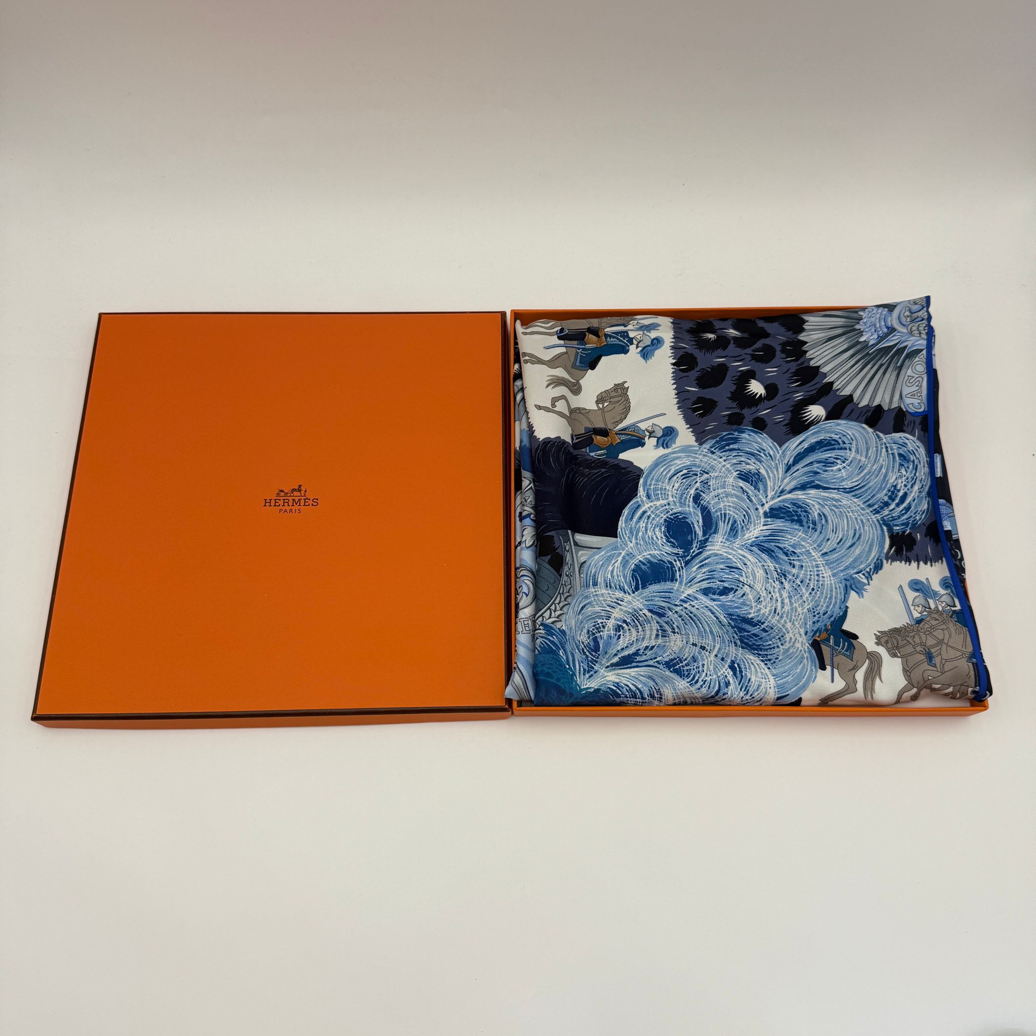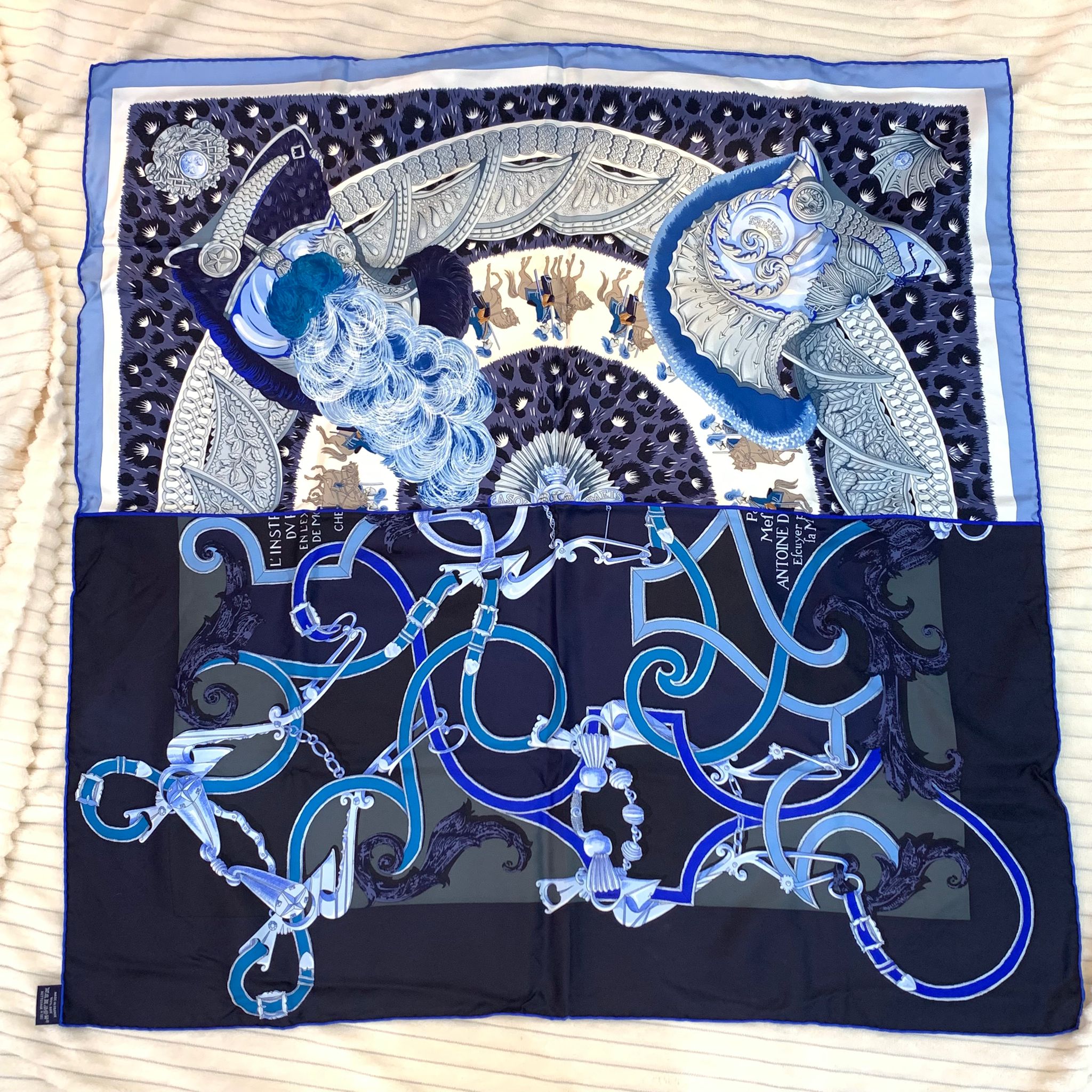 Hermes Plumets du Roy Blue Split 90cm silk Scarf 閒置新 愛馬仕/Hermes 圍巾披肩大方巾 拼色限量款 絲巾 圖案 現貨出售 日本購買
