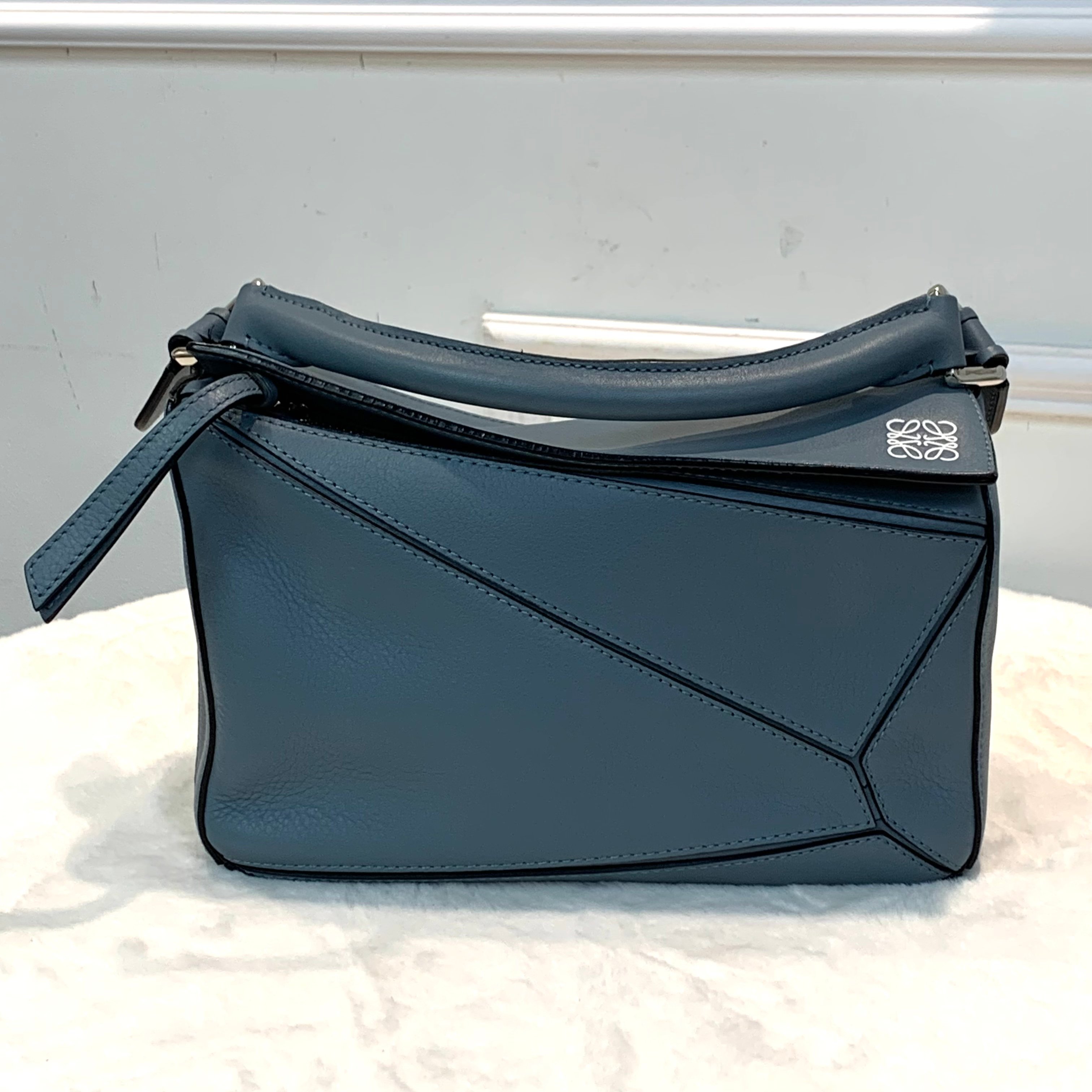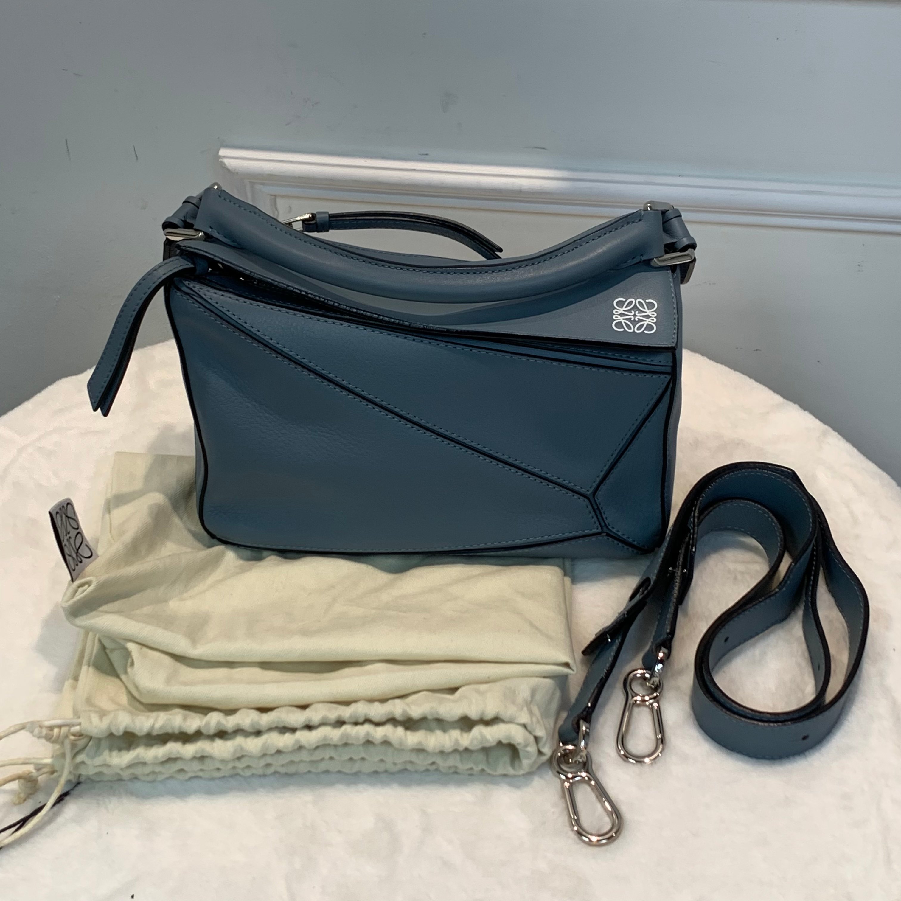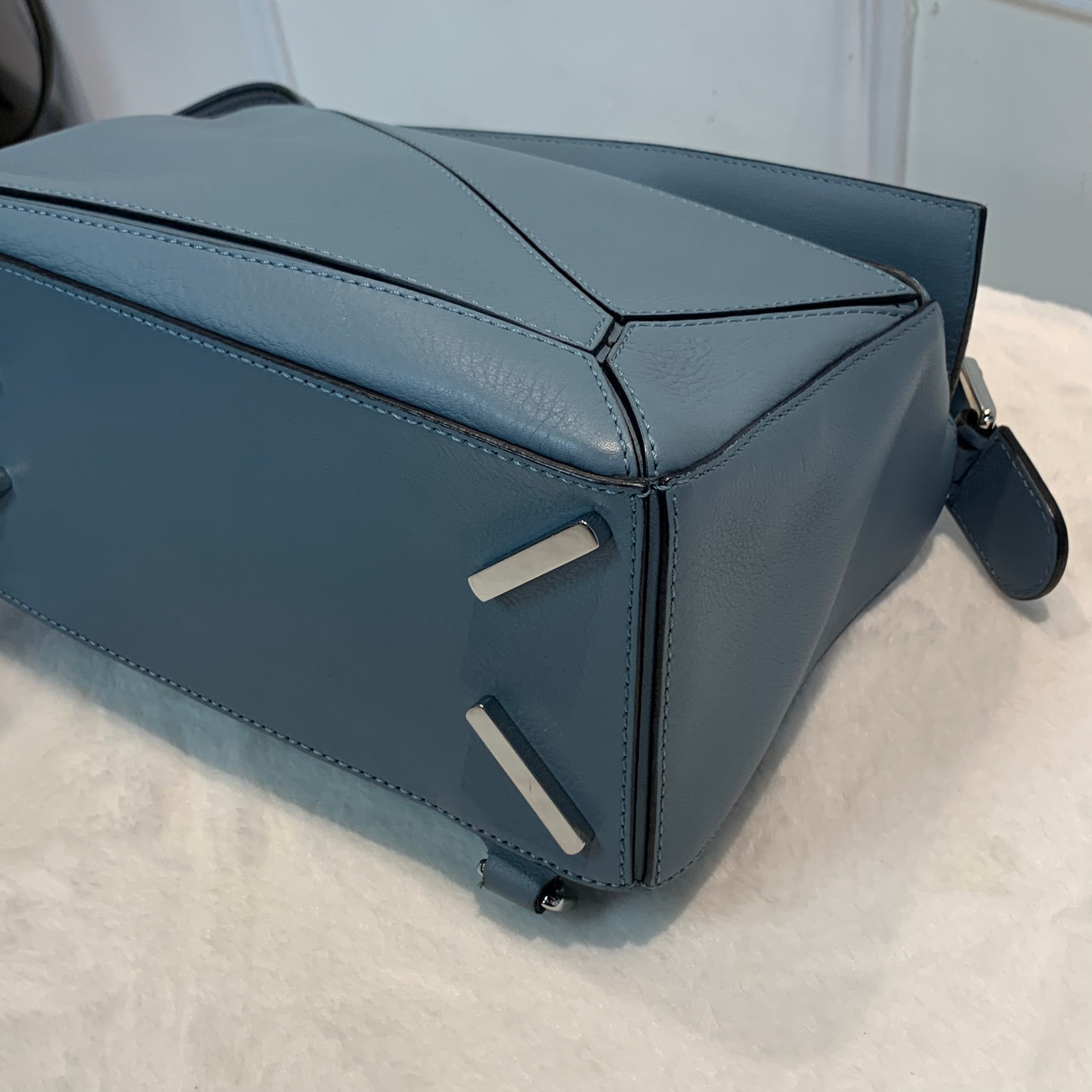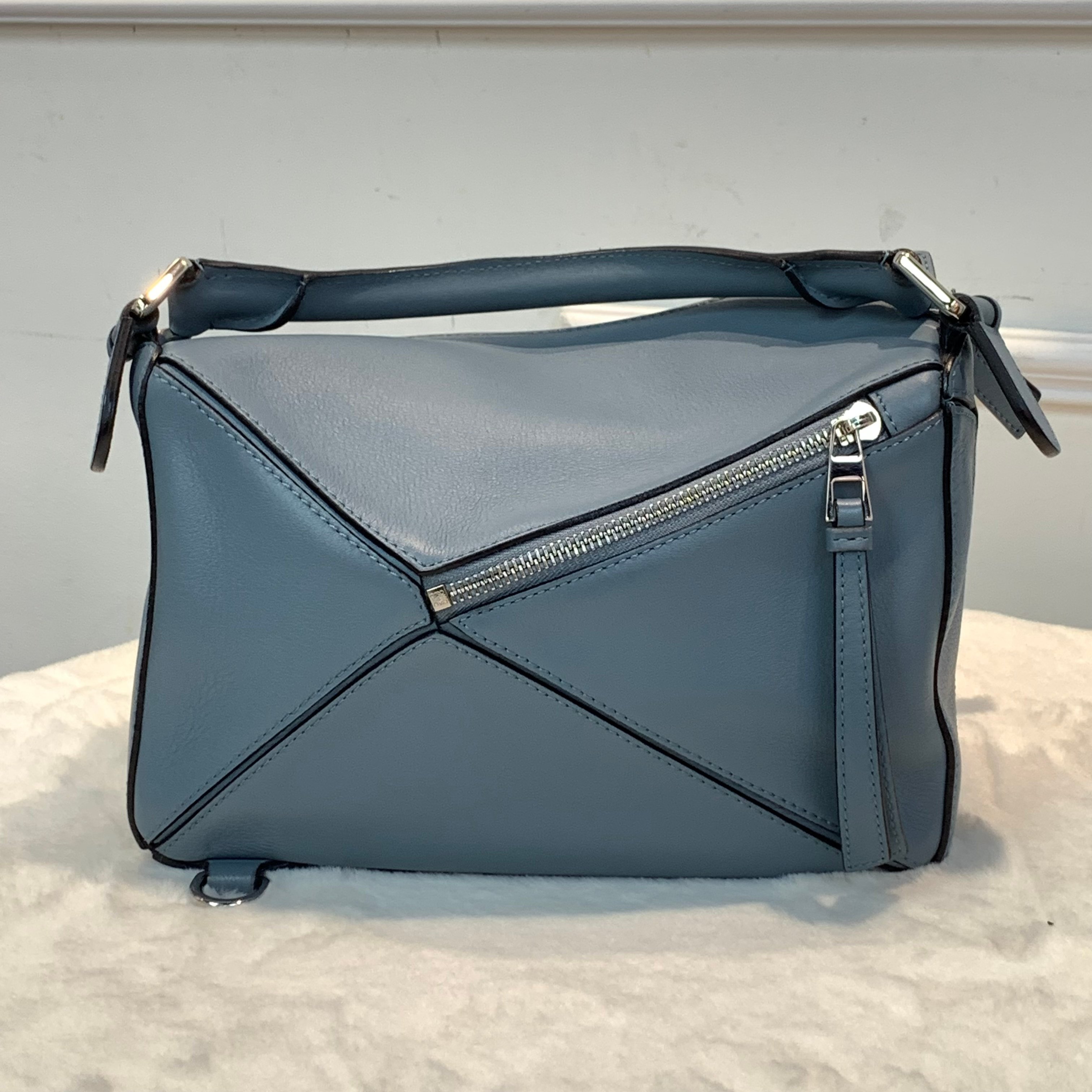 Loewe puzzle幾何包小號 全皮手提單肩斜挎包 最佳尺寸熱門包包 . 材質: 牛皮 顏色:藍色 尺寸底長: 約24cm 成色:輕微使用痕跡 年份:2016年 附件:防塵袋、肩帶 專櫃價:26000元