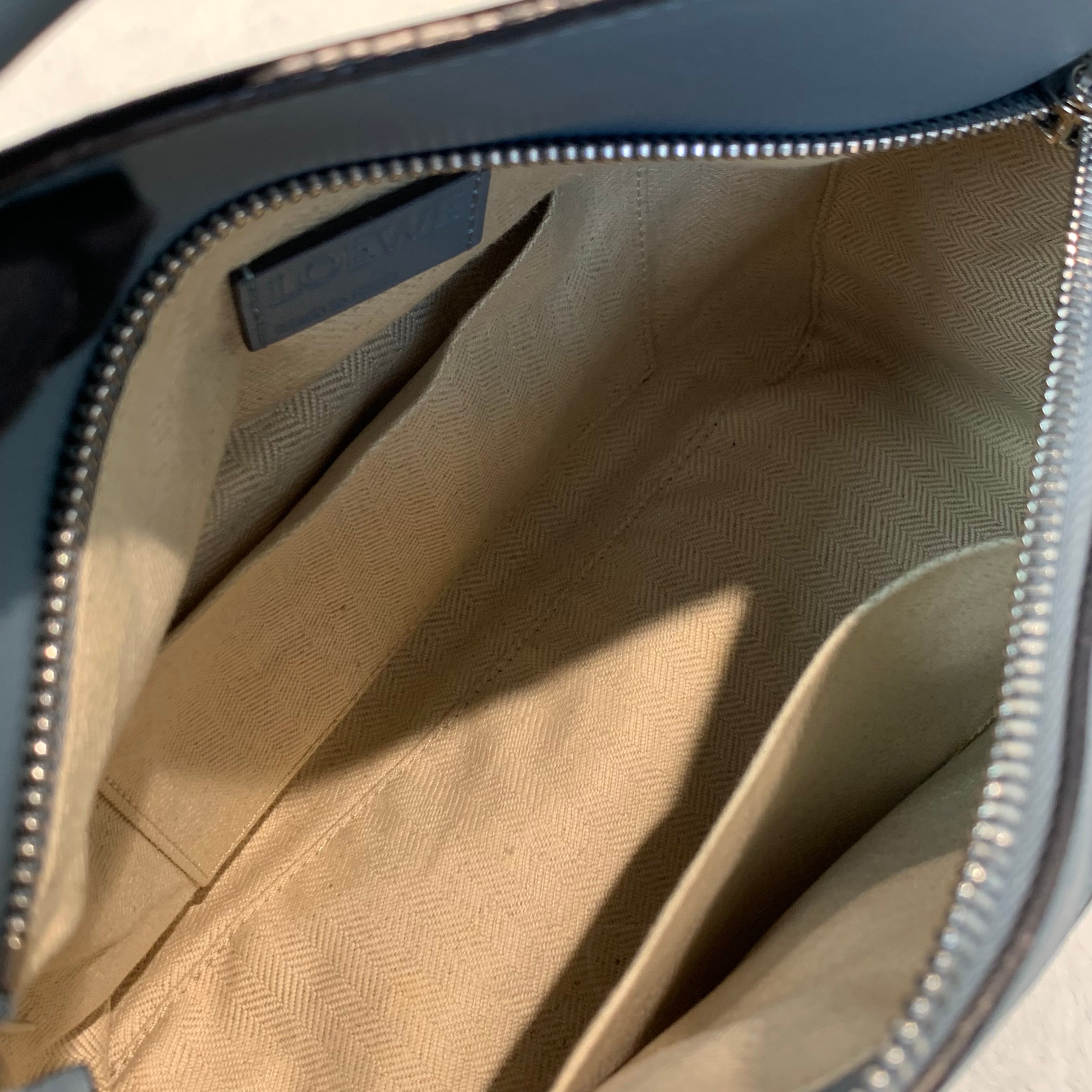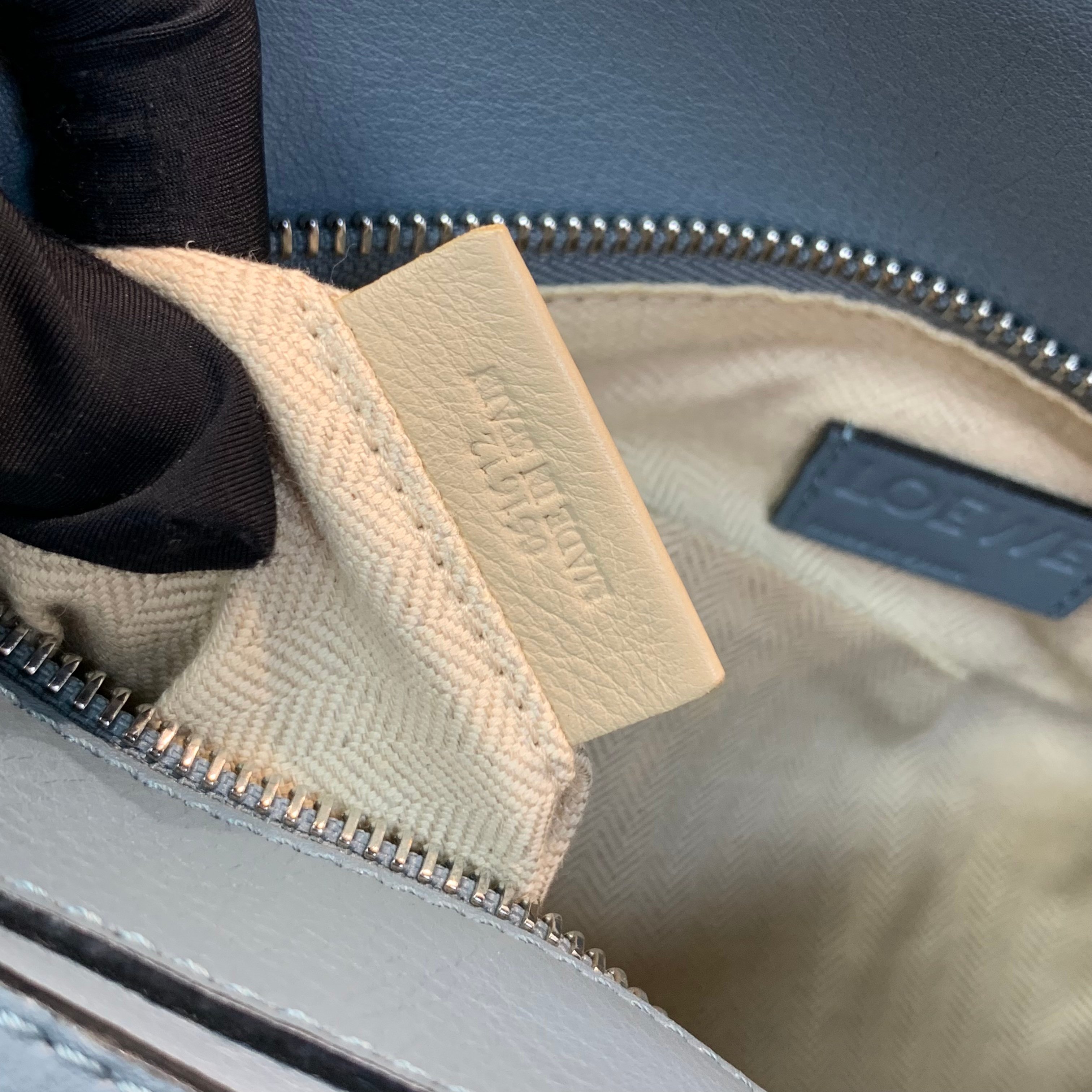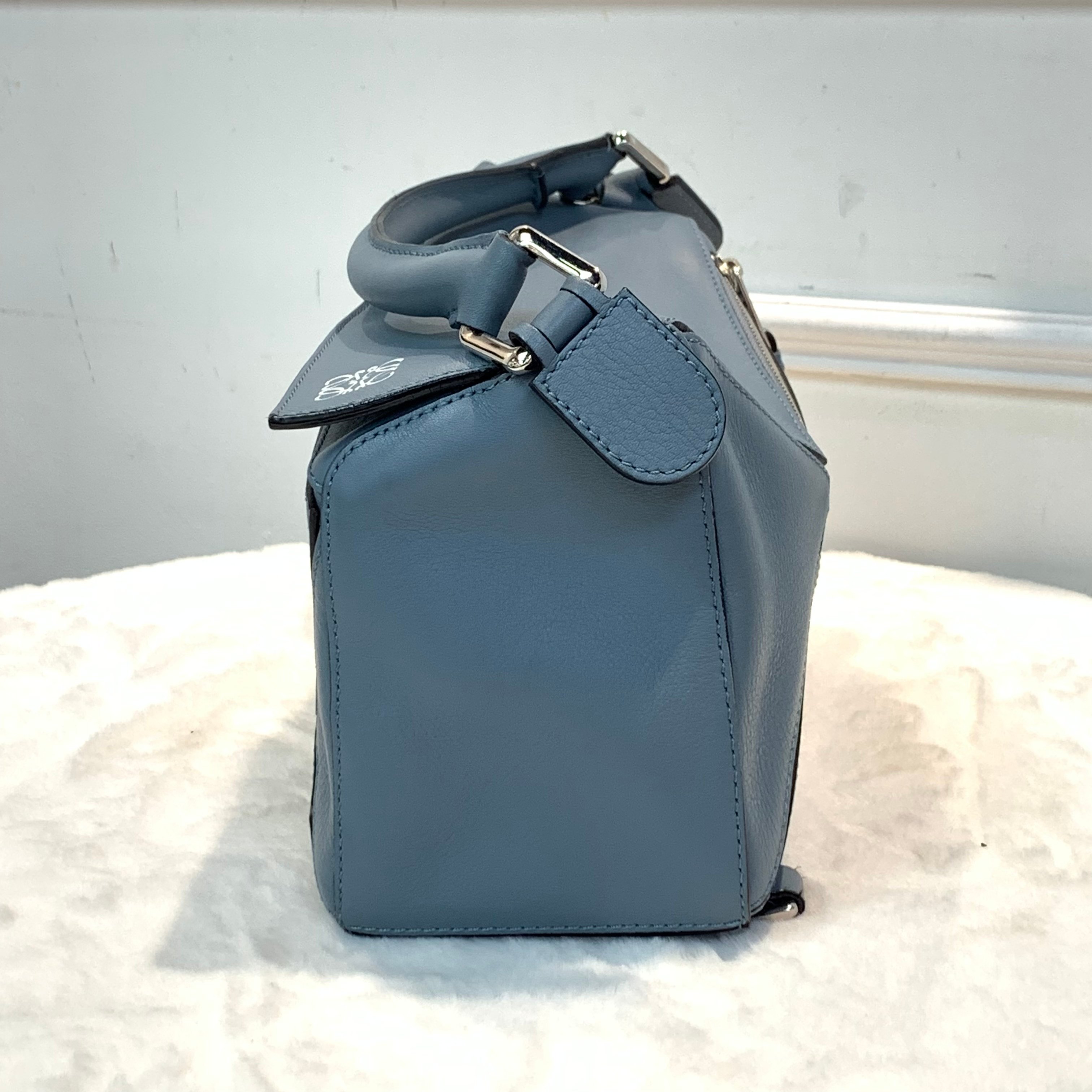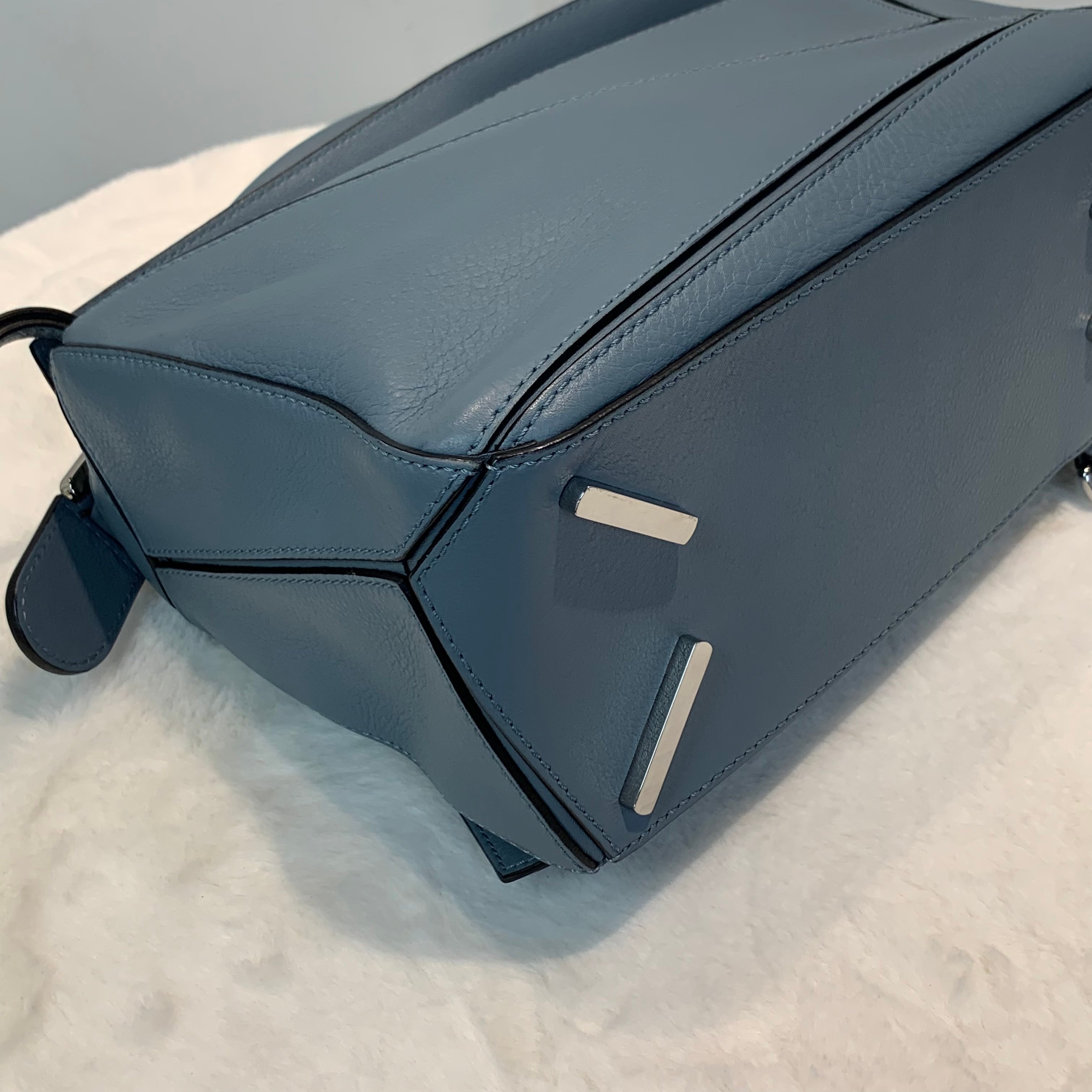 Loewe puzzle幾何包小號 全皮手提單肩斜挎包 最佳尺寸熱門包包 . 材質: 牛皮 顏色:藍色 尺寸底長: 約24cm 成色:輕微使用痕跡 年份:2016年 附件:防塵袋、肩帶 專櫃價:26000元